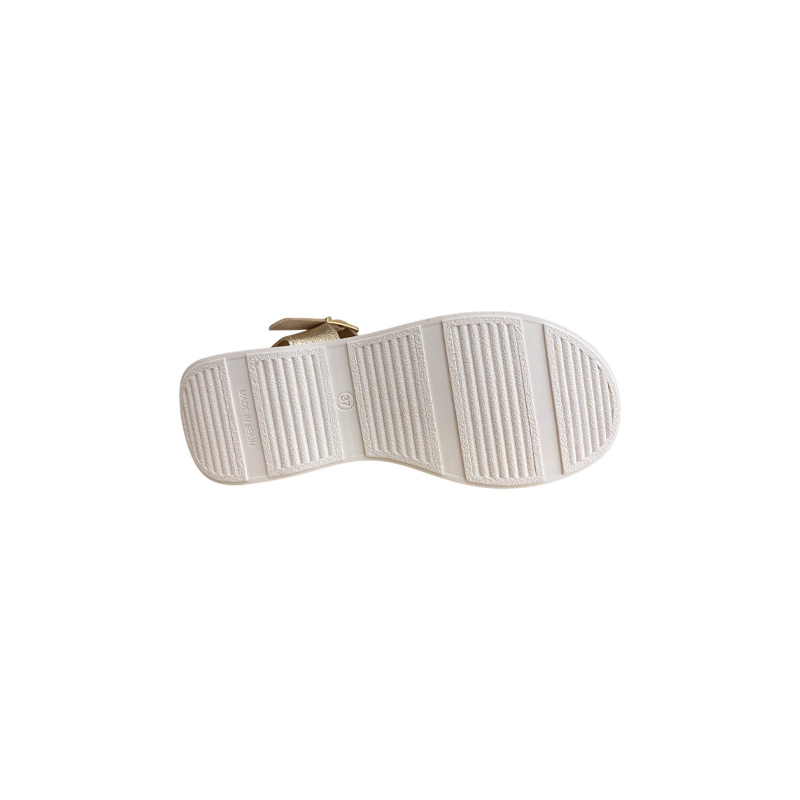 Γυναικείες πλατφόρμες δερμάτινες σε χρώμα Xρυσό. Το μοντέλο Duna Roble χαρακτηρίζεται από τους σταυρωτούς ιμάντες του στο πίσω μέρος, που αγκαλιάζουν ολόκληρο το πόδι και παρέχουν μεγαλύτερη στήριξη, χάρη και στο κλείσιμο με λουράκι στη φτέρνα. Άνετες χάρη στην επενδυμένη σόλα τους, καθιστώντας τες ιδανικές για καθημερινή χρήση.
